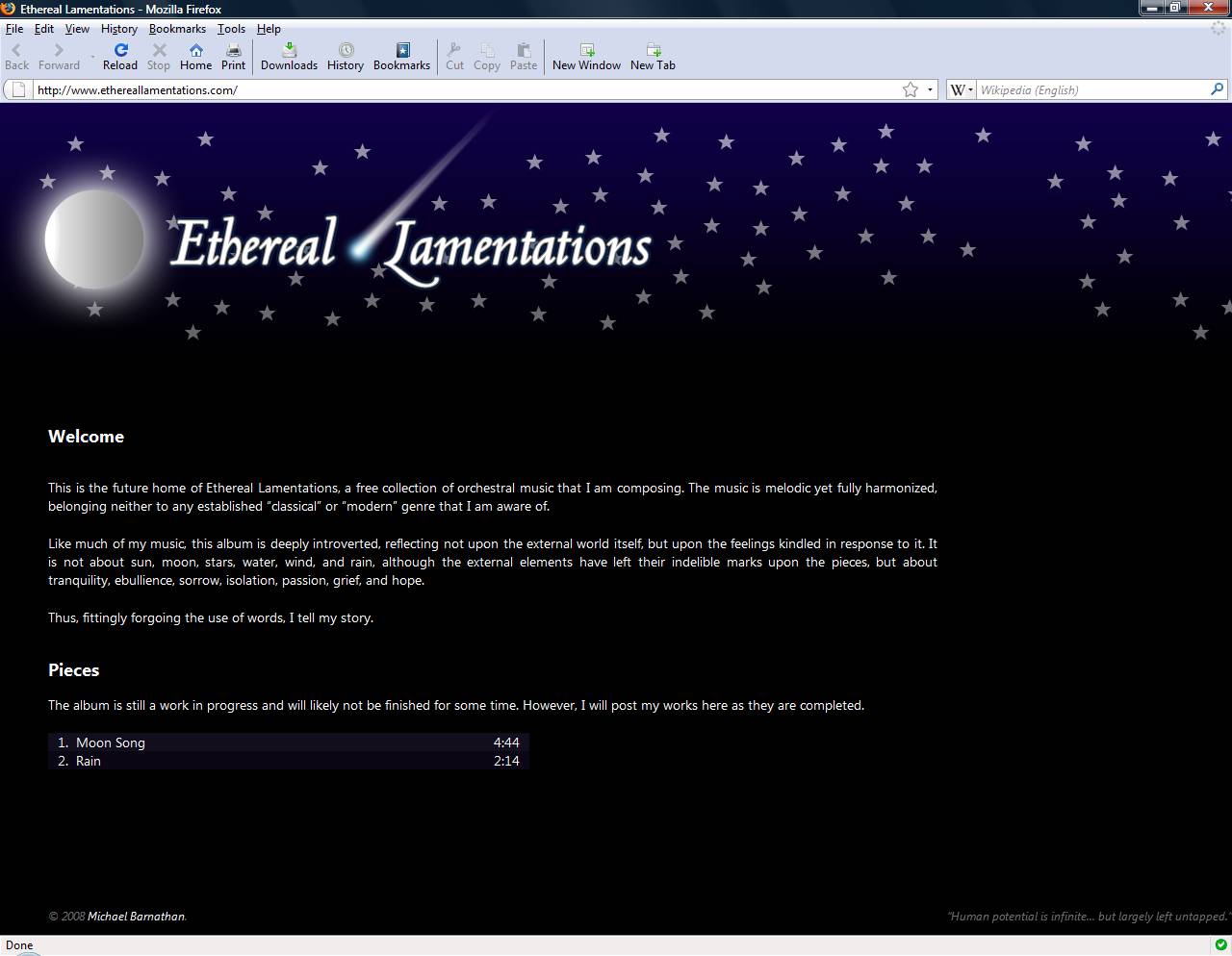 Ethereal Lamentations"Ethereal Lamentations" is to be the title of my first musical album. It will likely be in progress for a great deal of time, as I don't have the time I used to have to devote to my music, but I will post new pieces as they are written until the album is complete.